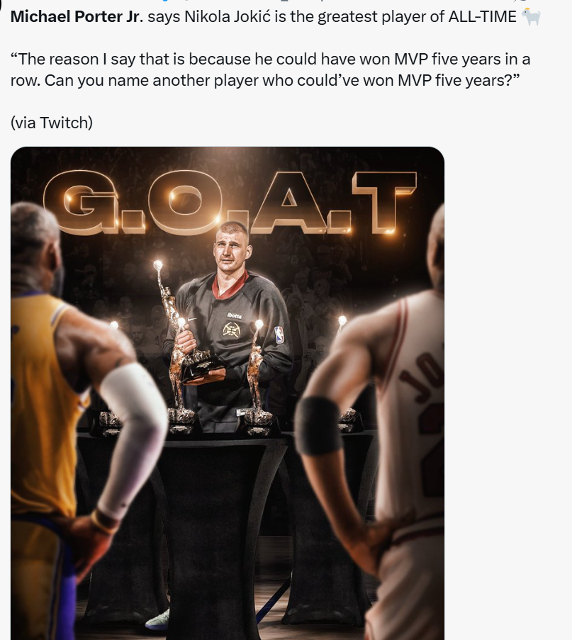 北京时间9月2日,根据美媒报道,在直播节目中,小迈克尔-波特说:“尼古拉-约基奇是史上最伟大的球员”。